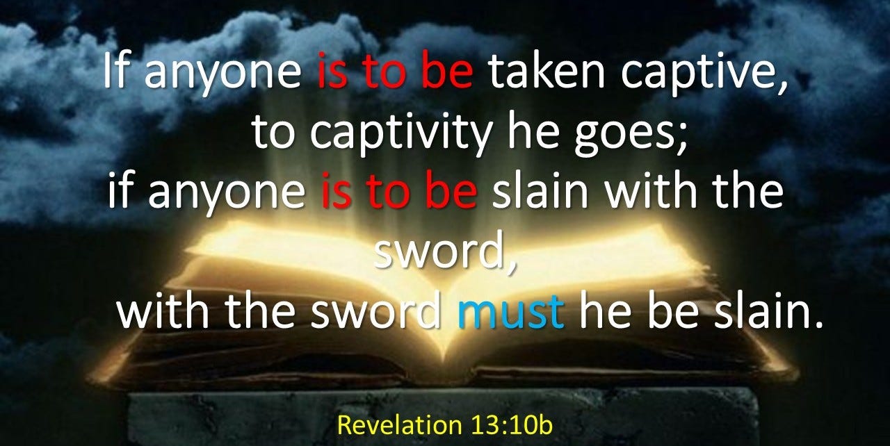 Revelation 13:10 states, “If anyone is to be taken captive, to captivity he goes; if anyone is to be slain with the sword, with the sword must he be slain.” The phrase “is to be” is key. It shows that even the persecutor and the persecuted are under God's sovereign control. It demonstrates God’s ultimate authority over all events, including suffering and death, which are part of His predestined plan for His glory and the fulfillment of His purposes. The term shows God’s sovereign decree. He has decreed that one person will be taken captive and another killed by the sword. Every event—be it captivity or death—is foreordained by God's divine will. It shows that nothing occurs outside God’s sovereign purpose. The phrase "is to be" signifies that these outcomes are not left up to chance or merely permitted. They are directly determined by God’s sovereign decree.